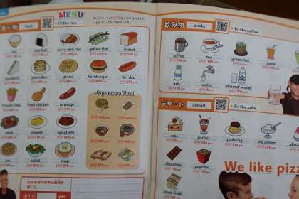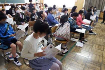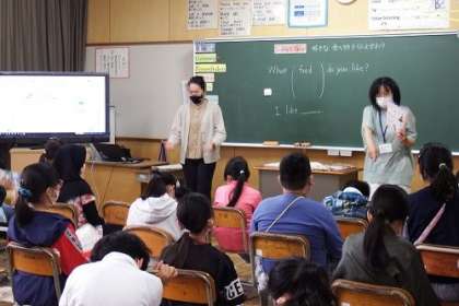 この日の英語の学習の課題は「好きな食べ物を伝え合おう」です。What food do you like?の基本文を使って、伝え合いました。