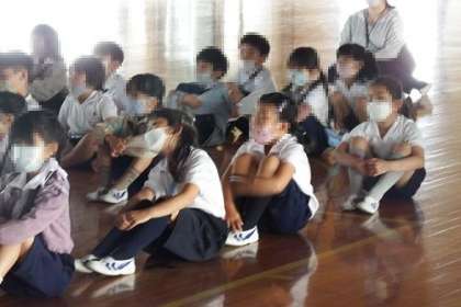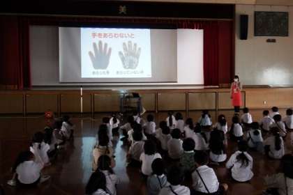 1年生を対象に「うがい・手あらい教室」をテーマにした学校保健委員会を開催しました。明治(株)の方を講師にお招きし、クイズなどを織り交ぜながら、楽しくお話をしていただきました。