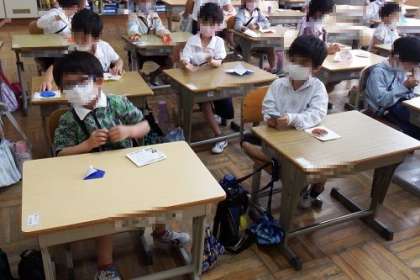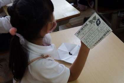 2年生から1年生へ、あさがおの種のプレゼント。メッセージ付きの袋の中に入れて、一人一人に渡されました。この種を使って、あさがおを大切に育ててほしいです。