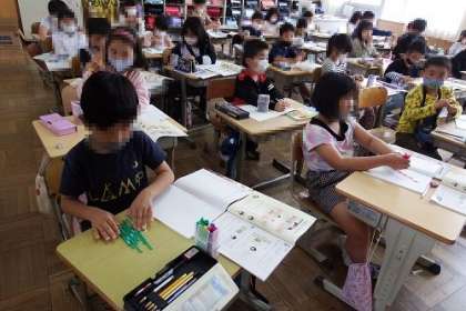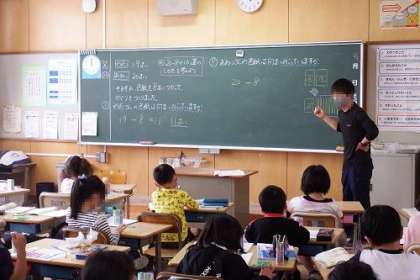 算数「たし算とひき算」の学習です。この日は、2けた−1けたのひき算を仕方を考えました。数え棒の10の束から1けたをひくことを学習ました。