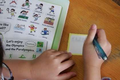 この日の英語の学習の課題は「名刺交換して自分のことを英語で伝えよう」です。自分の名前を英語で書き、すきなスポーツやすきな食べ物を書き込んだ名刺を作ります。