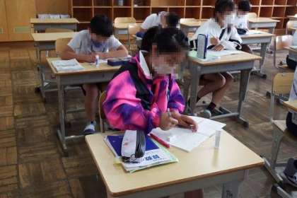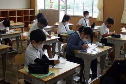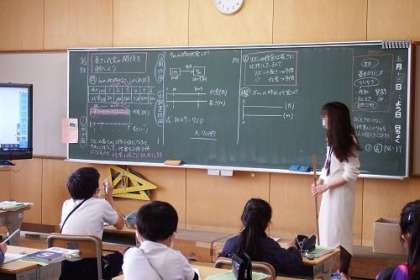 算数で「比例」の学習に入りました。写真は、リボンの長さと代金の関係を、表を使って調べているところです。長さが2倍、3倍になると、代金も2倍、3倍になることに気づきました。