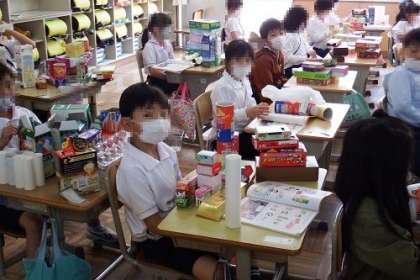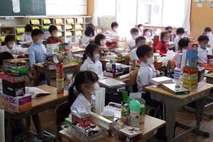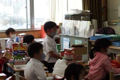 お家からもってきたたくさんの箱を机の上に並べ、とても嬉しそう。早く授業が始まらないかな。算数「いろいろな かたち」の学習に入りました。「まるいかたち、さんかくのかたち、ながしかくのかたち」まずは、仲間分けからです。