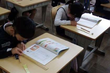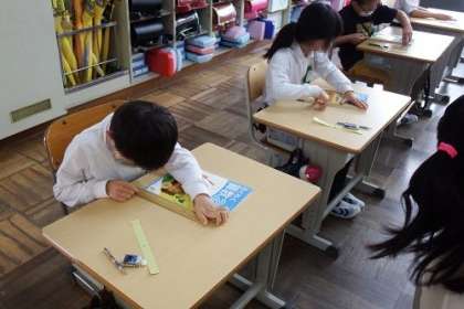 算数「長さ」の学習に取り組んでいます。はがきの縦横の長さやノートの縦横の長さをものさしをつかってはかってみました。センチやミリなどの長さの単位を学習します。
