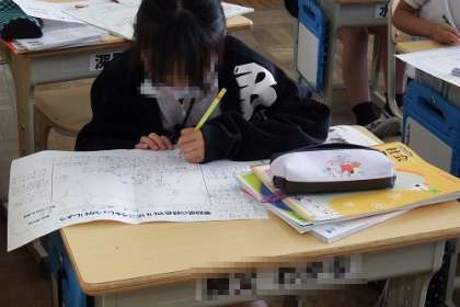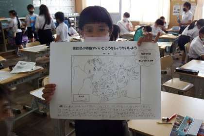 4年生は社会科で、愛知県について学習しています。この日は、白地図を使って、愛知県の特色やいいところを紹介するマップづくりを進めました。