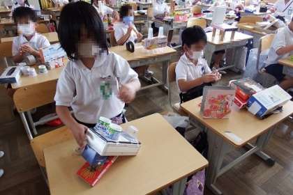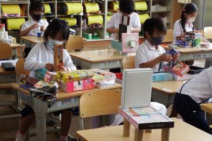 図工「はこでつくったよ」の学習に取り組みました。大きい箱、小さい箱、四角い箱、丸い箱、いろいろな箱を組み合わせて、動物や乗り物などを作り上げました。