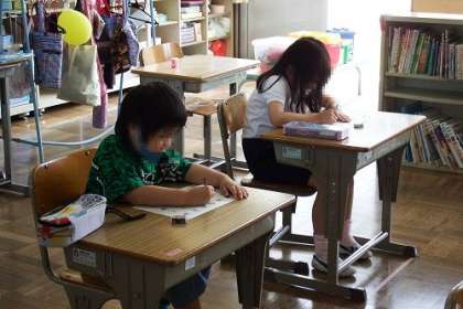 書写を行う上で姿勢はとても大切です。「あきは ぐうひとつ」「あしは ぴたっ」「せなかは ぴんっ」などの言葉を使って徹底しています。集中して取り組める時間です。