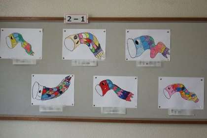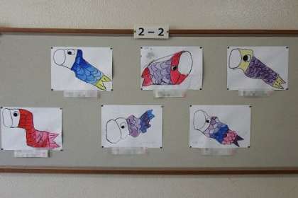 図工「カラフルこいのぼり」が完成に、教室などに掲示されています。写真は、学年掲示板に掲示されている作品の紹介です。2年1組と2組です。