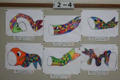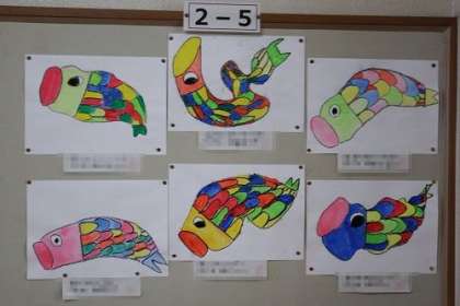 図工「カラフルこいのぼり」が完成に、教室などに掲示されています。写真は、学年掲示板に掲示されている作品の紹介です。2年3組と4組と5組です。