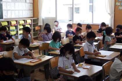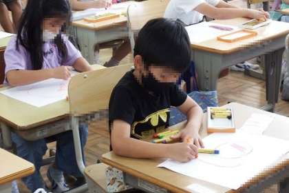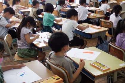 写真は、図工「おひさま にこにこ」の学習の様子です。「せかいにひとつだけのおひさまをかこう」を課題に取り組みました。オレンジや赤、ピンク、レインボーなど、自分だけのおひさまがたくさんできあがりました。