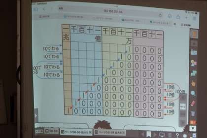 算数「億をこえる数」の学習の様子です。この日は、兆までの数のしくみについて考えました。10倍したり10で割ったりしていくと、位がどのように変わるか調べました。