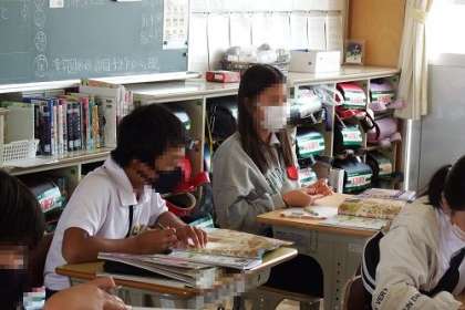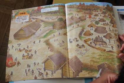 社会科で歴史学習に入りました。「縄文のむらから古墳のくにへ」で、この日は、条文の人々のくらしを考えました。縄文時代の一枚絵から当時の人々のくらしを・・・。
