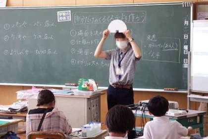自分の国、くるくるランドを作ります。円の上に3つのランドを制作し、くるくる回るようにします。学習に入ったところです。子どもたちはどんな作品を作ろうか、イメージを膨らませています。