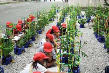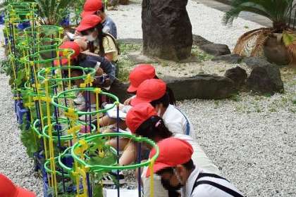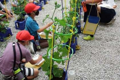 中庭で2年生が植えた野菜が育っています。中にも、もう実がなっている物もあります。「こんなのができた」と言って見せにきてくれる子もいます。大きくなれと願いをこめながら、観察記録をとり続けます。