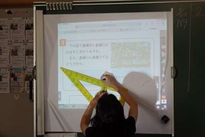算数「垂直・平行と四角形」の学習です。この日は、直線を伸ばすと交わるかどうかを考えました。伸ばしても交わらない2本の直線は・・・。