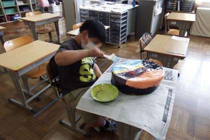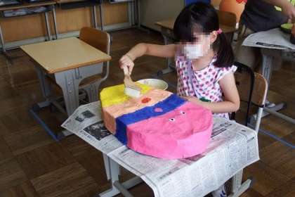 お面作り進みました。色を付けた後、この日はいよいよニスぬりです。1か所に塗りすぎないように、ニスをしっかりと伸ばしながら均等に塗っていきます。もう少しで完成です。