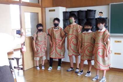 6年生が出前授業を実施しました。講師として豊田市郷土資料館の方をお招きし、縄文時代や弥生時代の服を着たり、土器や石器を触ったりしました。当時の人々の思いを感じることができました。