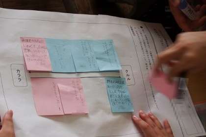 国語「風切るつばさ」で、人物どうしの関係に気をつけて読み取りを進めています。この日は、各グループで付せんを使いながら、クルルとカララの関係を図にまとめました。