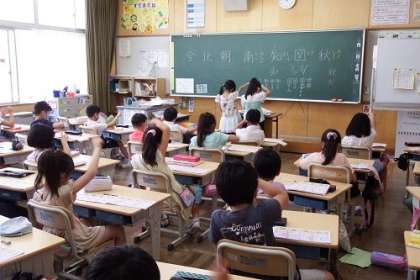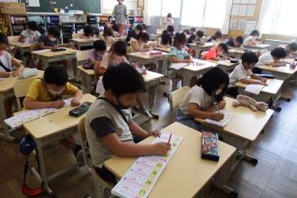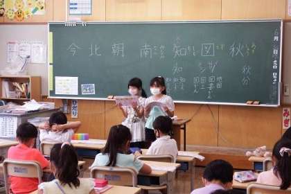 国語でドリルを使って漢字の練習をします。係の子どもたちが前に出て、みんなの練習をリードしてくれます。たくさん練習して、しっかりと覚えましょう。