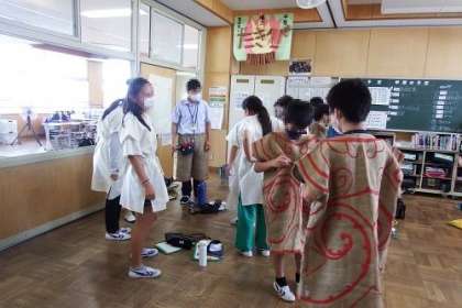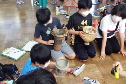 郷土資料館を方を講師に出前授業を行いました。先日は2クラスだったので、この日は、残りの2クラスです。縄文人と弥生人の服を着て比較したり、土器を触ったり。実感する学習ができました。