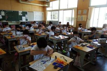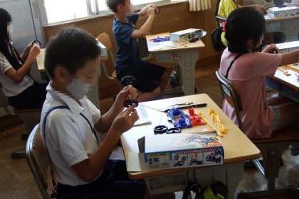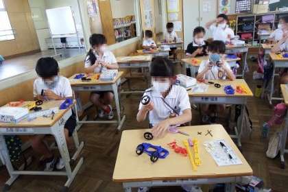 理科「ゴムや風の力」の学習に入りました。この日は、ゴムで走る車づくりに挑戦です。みんな、設計図を見ながら、どうやって作るのか考えます。出来上がっていくのがとても嬉しそうでした。