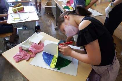 図工「くるくるランド」で、夢の国づくりが進んでいます。色をつけたり、置くものを作ってのりづけしたり。完成が待ち遠しいです。