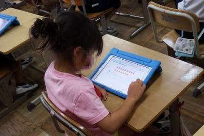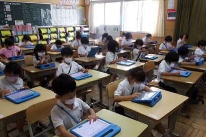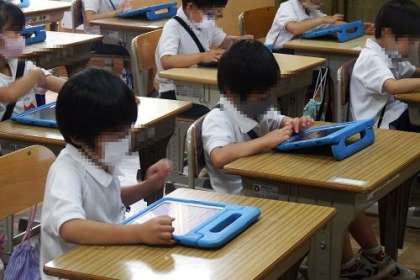 1年生はタブレットでキュビナの活用を始めました。タブレット自体を使い始めて、まだ間もない子どもたちですが、キュビナの使い方にも興味津々。集中して取り組んでいます。