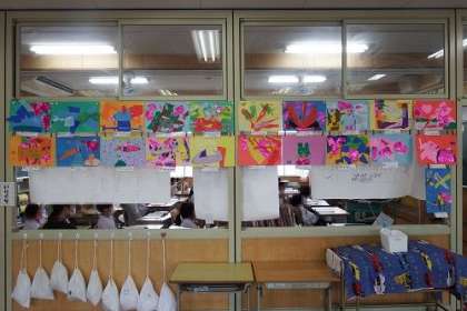 図工で取り組んだ「やぶいたかたちからうまれたよ」の作品を廊下側に掲示しました。色紙をちぎりながらつくった絵です。絵の具やクレヨンとはまた違った味があります。