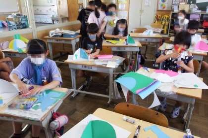 図工で取り組んでいる「くるくるランド」みんな完成が近づいてきました。色紙を張り付けたり、切込みを入れたり。思い思いの工夫をしながら、素敵な作品に仕上げています。