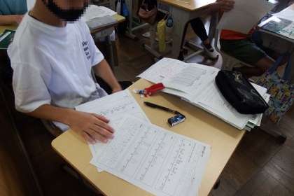 算数「資料の調べ方」では、資料の様々な整理の仕方やくらべ方について学習しています。写真は、ドットプロット(数直線を使って、ちらばりのようすを表したもの)の学習の様子です。