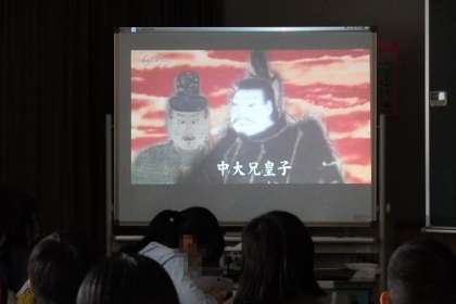 社会科で、飛鳥時代を学習しています。この日は、聖徳太子の死後起こった大化の改新について学びました。中大兄皇子や中臣鎌足の国づくりについて深めていきます。