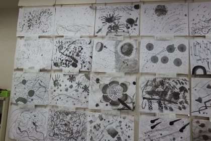 図工で「墨と広がる世界」と題して、墨で描く絵作りに挑戦しました。星空や花火の様子を描いたり、宇宙を想像して描いたり。水彩ではない墨で描く絵のよさを味わいました。