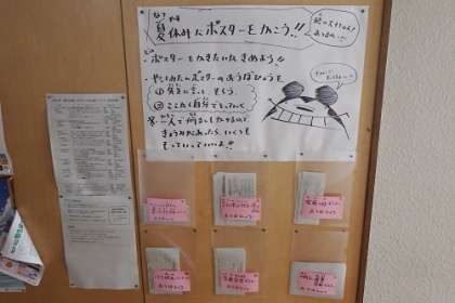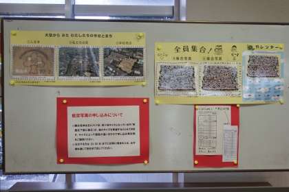 夏休みのポスターの応募募集が、職員室前の掲示板に掲示されています。ぜひ、描いてみたい人は積極的に応募してください。60周年記念の航空写真の注文も、昇降口付近にあります。見本の写真を見てください。自分の姿を見つけられるかな。
