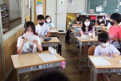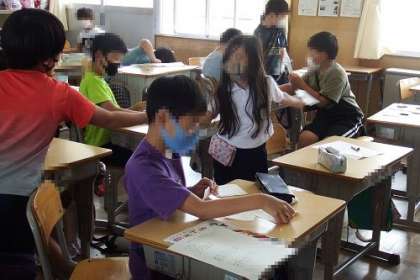 図工で描き上げた絵の鑑賞会を、○年○組美じゅつ館として実施しました。色やていねいさなど作品のよさを見つけ、カードに書き、友達に伝えてあげます。友達がくれた文章を読み子どもたちの顔がとても真剣です。