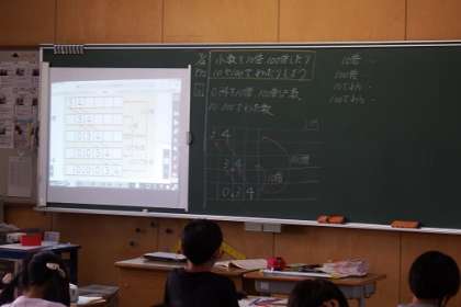算数「小数」の学習です。この日は、小数を10倍、100倍にしたり、10や100でわったりした数を調べました。小数も整数と同じように、各位の数字が10倍すると1つあがり、10でわると1つ下がることが分かりました。