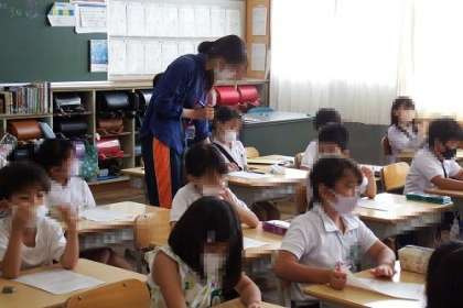 資料「ぎおんまつり」を使って道徳の学習に取り組みました。京都祇園祭りでほこに乗って太鼓をたたいているぼく。やめたくなったこともあるが、1000年も続く祭りを守る大切さをあらためて実感した。