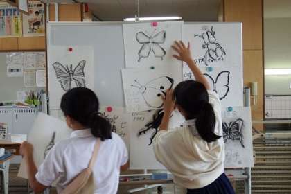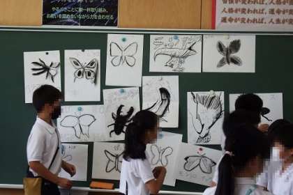 図工パステル画で生物を描きました。白黒であらわされる世界ですが、体の形や動きをしっかりととらえ、表現することができました。この日は、みんなで作品の鑑賞を行いました。