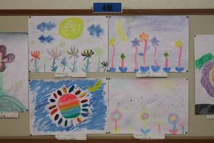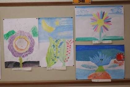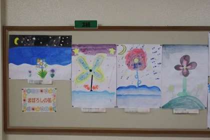 図工で取り組んできた「まぼろしの花」の作品が完成しました。世界に一つだけのまばろしの花ができあがりました。学年掲示板の作品を紹介します。写真は、4年3組と4組と5組の作品です。