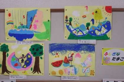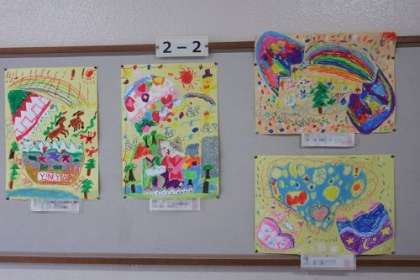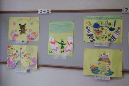 図工「ふしぎなたまご」の作品が完成し、子どもたちの素敵な作品が教室や広場などに掲示されています。学年掲示板の作品を紹介します。写真は、2年1組と2組と3組の作品です。