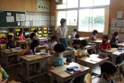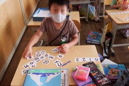 写真は、7月20日の様子です。算数「10よりおおきいかず」で、かずのならびかたを学習しました。机の上に1〜20までのカードを順番に並べます。