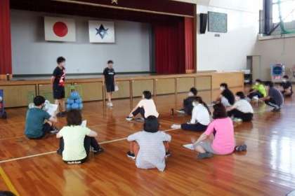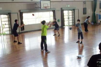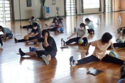 校内OJTで、体育の研修を行いました。この日は、学年に応じた体つくり運動やボール運動について学びました。ボールを使って、ソロ、ペア、グループで運動したり、キャッチバレーを行ったりしました。
