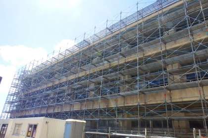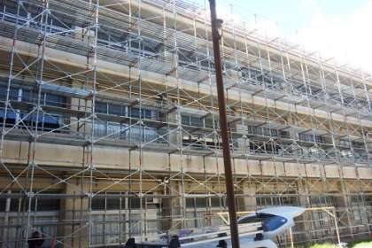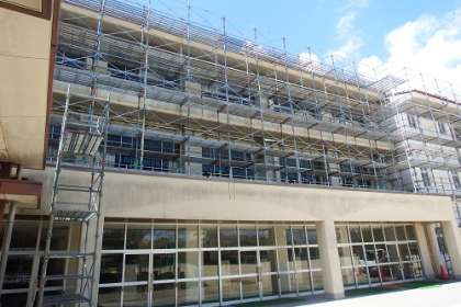 大規模保全改修工事が着々と進んでいます。現在は、工事のための足場が3階の高さまでできあがり、北棟の校舎を覆うようになりました。これから本格的な工事が始まる予定です。