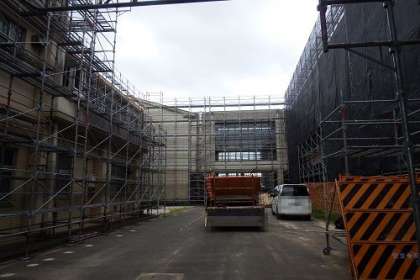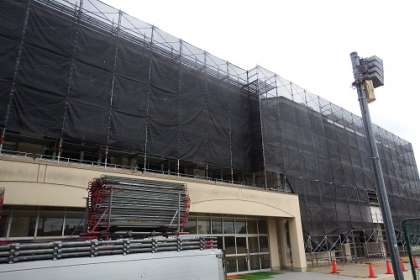 保全改修工事が進んでいます。南棟の足場設置も始まり、中庭は、足場で囲まれている状態です。北棟には、シートがかかり始めました。