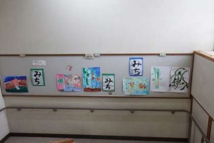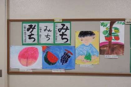 子どもたちが夏休みに作成した作品の一部を、学年掲示板に掲示しています。写真は、1年生の作品です。小学校に入学して初めての夏休み、頑張りました。