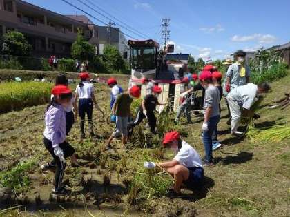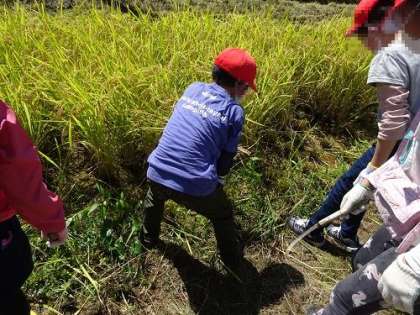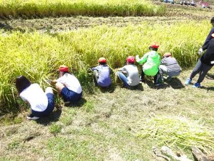 5年生が稲刈りを行いました。すくすく育った稲を、農協と皆様のご指導を受けながら、協力して刈り取りました。稲刈り体験が初めての子も多く、とても貴重な経験になりました。