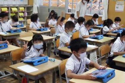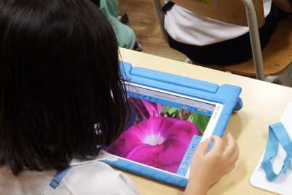 アサガオの観察記録をタブレットを使って作成します。写真を撮ったり、文字を入れたり。タブレットを使い始めたばかりと思っていた1年生が、もうこんなに使えるようになりました。