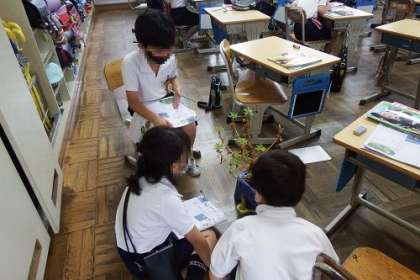 理科「植物の育ち方」の学習に取り組んでいます。この日は、ホウセンカの花が咲き終わった後の様子を観察しました。夏休み前にあんなにきれいだったホウセンカの花も今は・・・。これからどうなるのでしょうか。