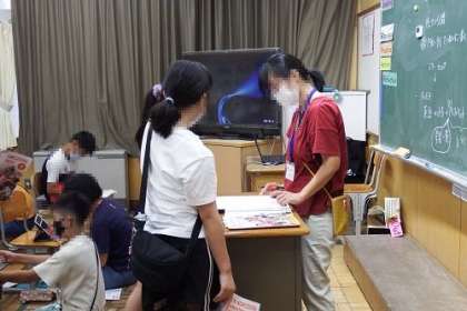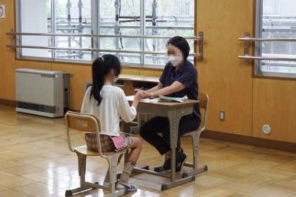 今日の英語の課題は「ALTの先生に、レベルアップした自己紹介スピーチをしよう」です。一人ひとりALTの先生に自己紹介をしていきます。少し緊張いながら笑顔でスピーチできました。