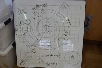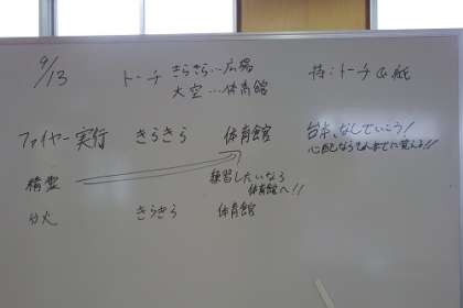5年生の学年広場には、キャンプのファイアーの進め方の図や各係への指示などがホワイトボードで示されています。いよいよ明後日からキャンプです。