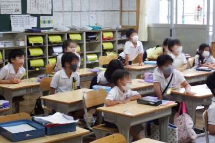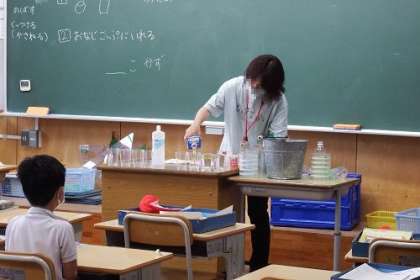 算数「おおきさくらべ」の学習を行いました。今日は、「かさくらべ」です。形の違う2つの入れ物。さて、どちらがたくさん水が入るのでしょうか。子どもたちは、先生が行う実験を目を皿のように見ています。